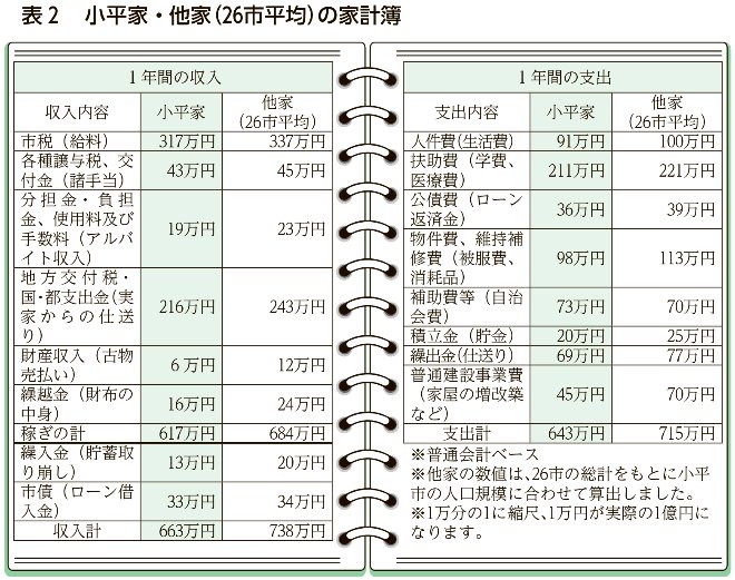一般会計決算を家計に例えて、小平市と多摩地区の他市を、小平家と同じ人数の他家として、1年間の家計簿を作成しました(表2参照)。