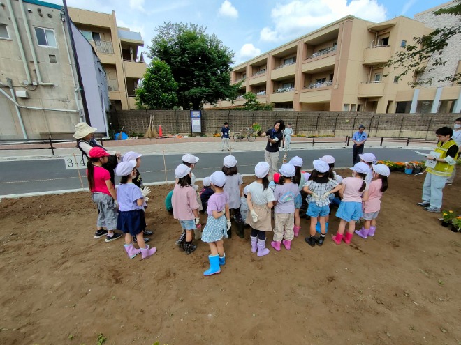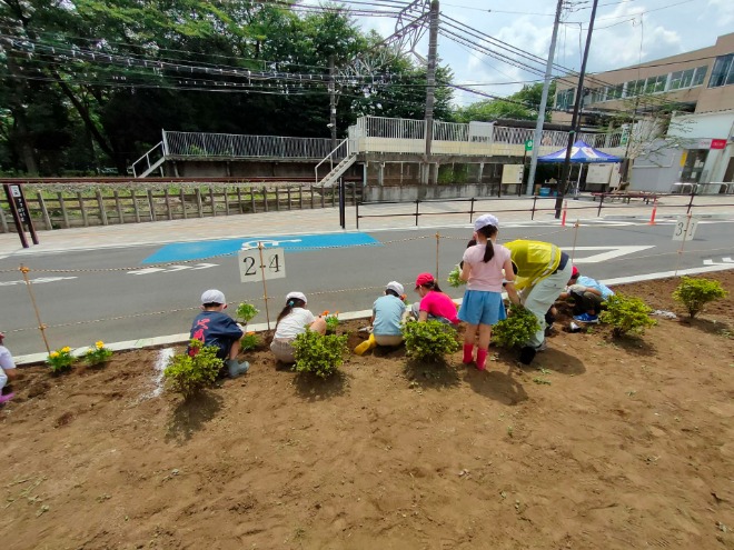 令和5年3月に完成した西武国分寺線鷹の台駅前広場の交通島に、小平市立小平第一小学校の第2学年の児童約90人の皆さんがマリーゴールドを植えてくれました。